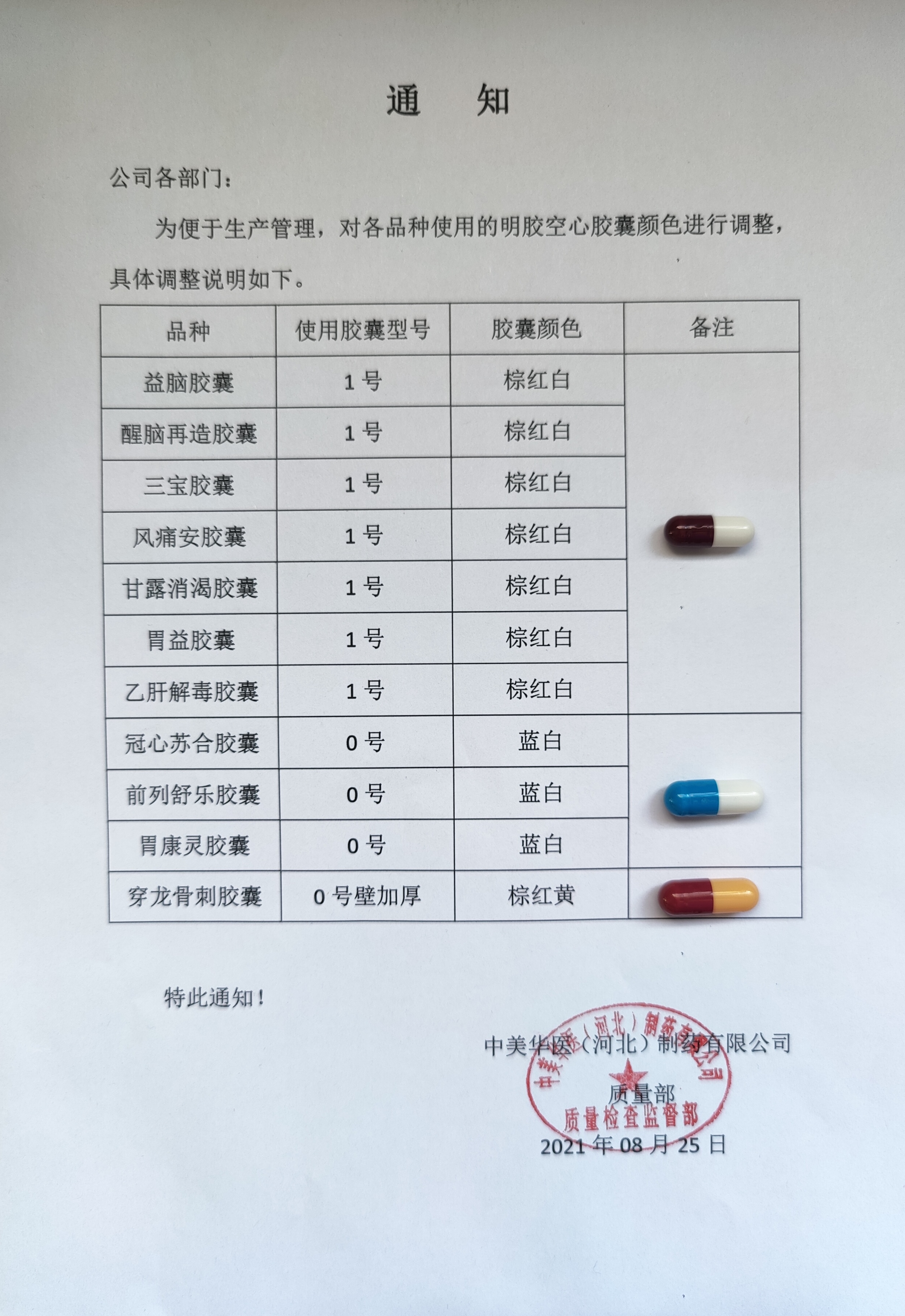 關(guān)于品種使用明膠空心膠囊顏色調(diào)整的通知