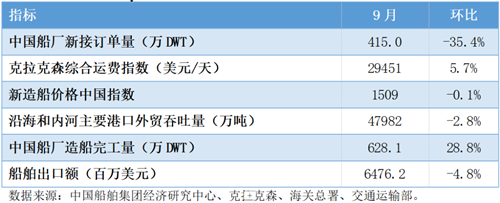 從重點監(jiān)測指標(biāo)看,2025年9月,中國造船業(yè)景氣先行指數(shù)主要分項指標(biāo)中,中國船廠承接新船訂單415.0萬載重噸,環(huán)比下降35.4%;克拉克森海運指數(shù)平均值為29451美元/天,環(huán)比上升5.7%;新造船價格中國指數(shù)為1509點,環(huán)比下降0.1%;沿海和內(nèi)河主要港口外貿(mào)吞吐量為47982萬噸,環(huán)比下降2.8%。中國造船業(yè)景氣同步指數(shù)重點分項指標(biāo)中,中國造船完工量為628.1萬載重噸,環(huán)比上升28.8%;船舶出口額為64.76億美元,環(huán)比下降4.8%。