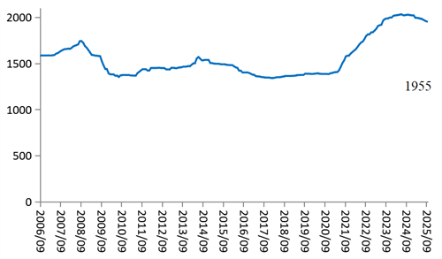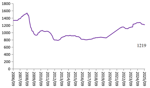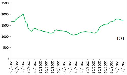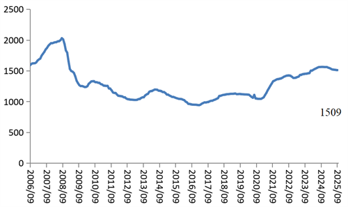 2025年9月,新造船價格中國指數(shù)為1509點,環(huán)比下降2點,其中,散貨船、集裝箱船、油船、液化氣船的新造船價格中國指數(shù)分別為1723點、1219點、1731點、1955點,環(huán)比分別變化-1點、0點、-1點、-7點。
