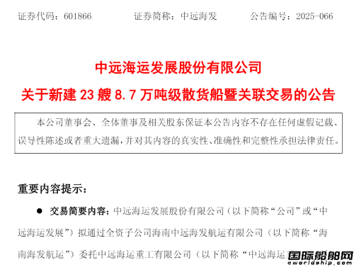 10月31日,中遠(yuǎn)海發(fā)宣布,擬通過全資子公司海南中遠(yuǎn)海發(fā)航運(yùn)有限公司委托大連中遠(yuǎn)海運(yùn)重工有限公司建造23艘8.7萬噸級散貨船,交易總金額人民幣73.37億元,單船船價(jià)為人民幣3.19億元(不含稅),預(yù)計(jì)首船將于2027年5月20日或更早的時(shí)間交付(不含稅),其他陸續(xù)于2028年底前交付。