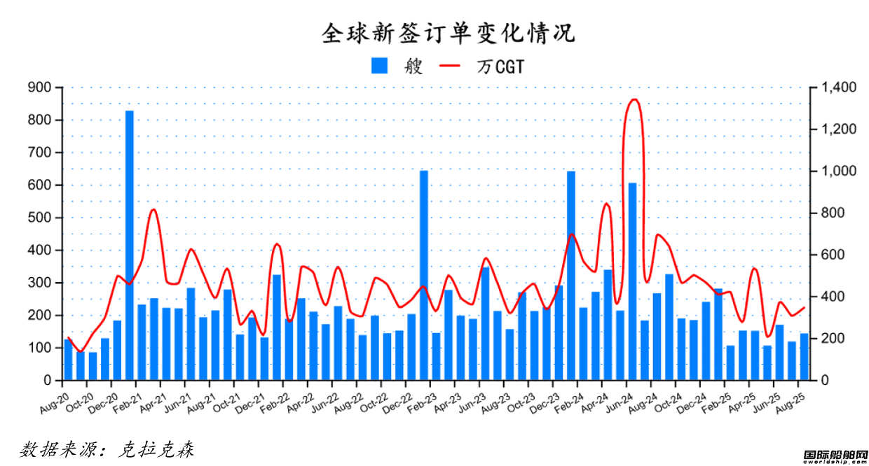 根據(jù)克拉克森最新數(shù)據(jù)統(tǒng)計(截至2025年9月10日),2025年8月份全球新簽訂單142艘,共計3,484,252CGT。與2025年7月份全球新簽訂單117艘,共計3,079,869CGT相比較,數(shù)量環(huán)比增加25艘,修正總噸環(huán)比上升13.13%。與2024年8月份全球新簽訂單266艘,共計6,963,830CGT相比較,數(shù)量同比減少124艘,修正總噸同比下降49.97%。