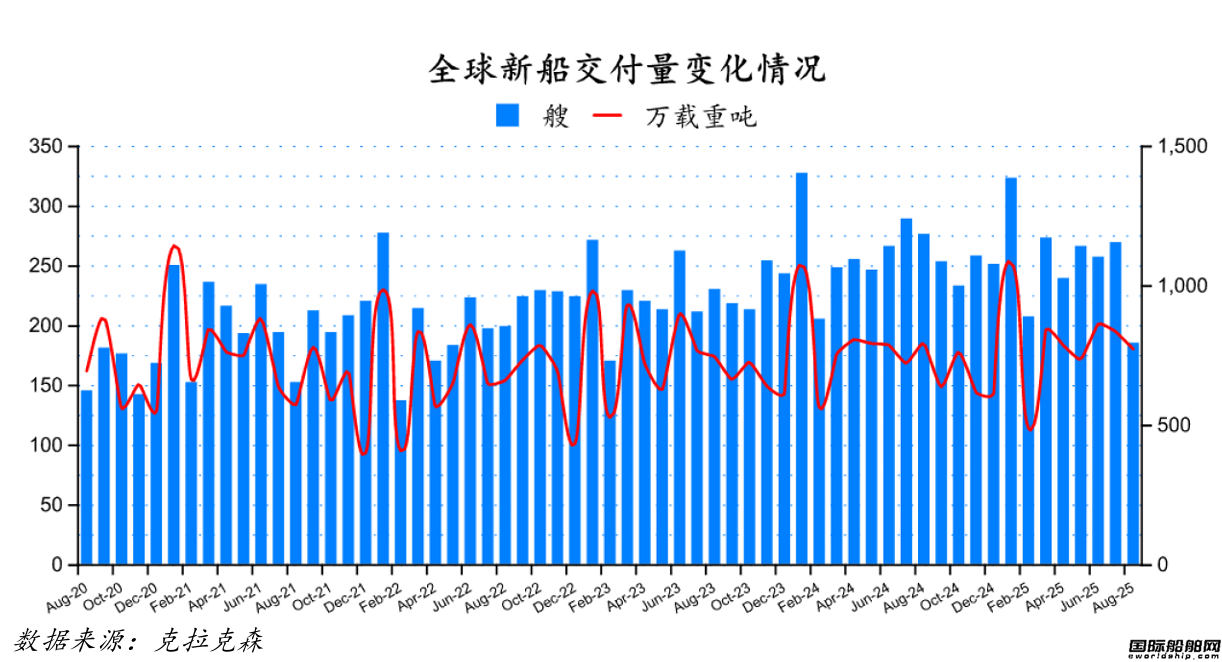 2025年8月份全球船廠共交付新船185艘,共計7,739,954載重噸。與2025年7月份全球新船交付訂單269艘,共計8,366,692載重噸相比較,數(shù)量環(huán)比下降31.23%,載重噸環(huán)比下降7.49%。與2024年8月份全球船廠共交付新船276艘,共計7,960,917載重噸相比較,數(shù)量同比下跌32.97%,載重噸同比下降2.77%。