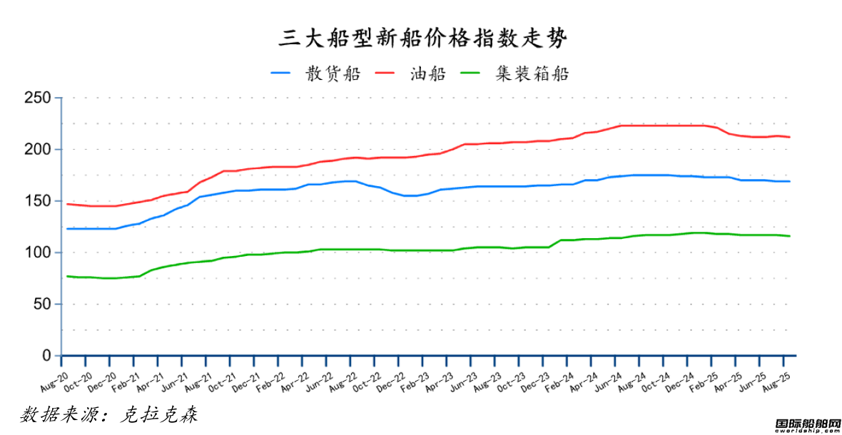 8月份散貨船新船價格指數(shù)環(huán)比持平,為169點(diǎn);油船和集裝箱船新船價格指數(shù)均環(huán)比下跌1點(diǎn),分別為212點(diǎn)、116點(diǎn)。