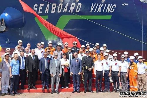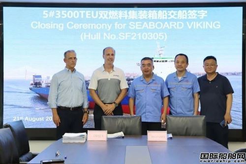 2025年8月22日上午,三福船舶為美國船東SEABOARD Marine建造的3500TEU雙燃料(LNG+MGO)集裝箱船系列第五艘"SEABOARD VIKING"號,在公司碼頭舉行了盛大的命名交付儀式。