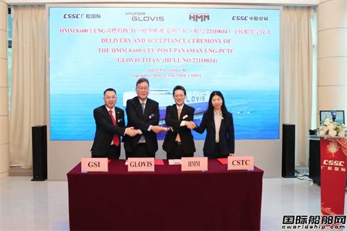 9月9日,中船集團(tuán)廣船國際聯(lián)合中船貿(mào)易為韓國HMM(韓新海運(yùn))建造的8600車汽車運(yùn)輸船1號船“GLOVIS TITAN(格羅維視 泰坦)”號命名交付。在該船的建造過程中,項目團(tuán)隊積極探索推行精益生產(chǎn),生產(chǎn)效率不斷提高,首制船較合同期大幅提前完成交付。