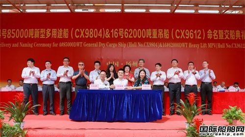9月11日,中船集團(tuán)旗下中船澄西船舶修造有限公司為中信金融租賃有限公司建造的4號(hào)84500噸干散貨船“CSPC LEO(中信獅子座)”輪和為交銀金融租賃有限責(zé)任公司建造的16號(hào)62000噸重吊多用途船“安福”輪在中船澄西揚(yáng)州公司同日命名交付。