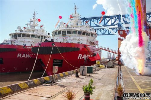 9月22日下午,南通中集太平洋海洋工程有限公司為新加坡客戶(hù)Vallianz Shipbuilding & Engineering Pte. Ltd.(簡(jiǎn)稱(chēng)“VSE”)建造的2艘80噸三用工作船S1099、S1100“RAWABI 64”號(hào)和“RAWABI 70”號(hào)在東區(qū)碼頭舉行命名交付儀式。