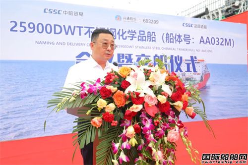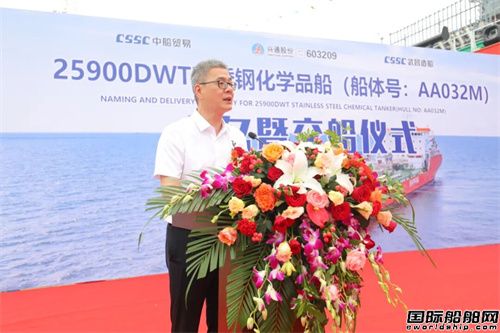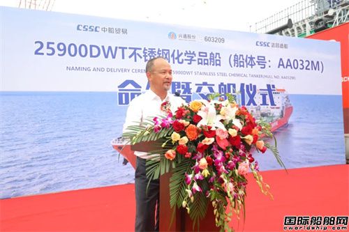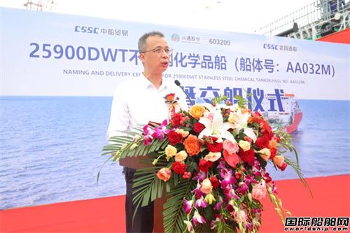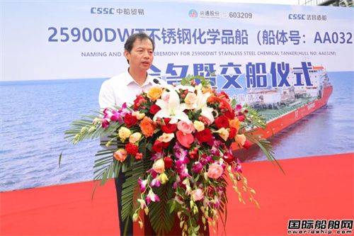 9月26日上午,中國船舶集團集團武昌造船聯(lián)合中船貿(mào)易為興通海運股份有限公司建造的首艘25900DWT不銹鋼化學(xué)品船“興通海獅(XT SEA LION)”輪在江蘇靖江舉行命名暨交船儀式。