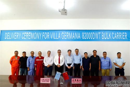 9月29日,京魯船業(yè)為L(zhǎng)askaridis Maritime公司建造的82000DWT散貨船“VILLA GERMANA”輪正式交付,該系列船至此圓滿收官。京魯船業(yè)黨委書(shū)記、總經(jīng)理王轟與Laskaridis Maritime公司代表Mr.