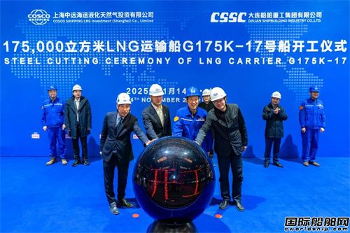 11月14日,大連造船為上海中遠海運液化天然氣投資有限公司建造的17.5 萬立方米LNG運輸船17號船開工。上海中遠海運液化天然氣投資有限公司黨委書記、董事長叢劍,副總經(jīng)理毛華宇;勞氏船級社大中華區(qū)副總裁張文;中國船級社建造處處長孫洋;大連造船副總經(jīng)理林吉明等出席儀式。