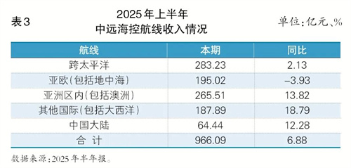 從區(qū)域維度切入,今年上半年中遠(yuǎn)?卦诩b箱航運(yùn)業(yè)務(wù)上的收入版圖呈現(xiàn)出“美洲領(lǐng)漲,歐洲負(fù)增長(zhǎng)”的鮮明特征:美洲地區(qū)貢獻(xiàn)收入 286.95億元,增幅2.62%,顯示高基數(shù)下的需求趨緩;亞太地區(qū)緊隨其后,但增速迅猛,達(dá)到13.61%,成為拉動(dòng)總收入增長(zhǎng)的重要引擎;歐洲地區(qū)則出現(xiàn)2.08% 的負(fù)增長(zhǎng),成為唯一收縮的主要區(qū)域(見表2)。