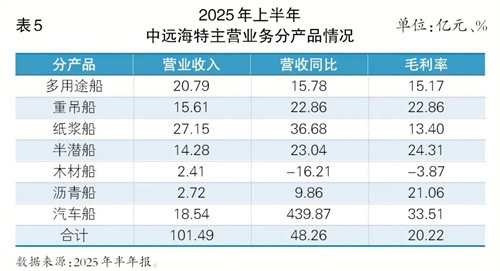 中遠(yuǎn)海特今年上半年表現(xiàn)亮眼:營(yíng)業(yè)收入107.75 億元,同比增長(zhǎng)44.05%;凈利潤(rùn)8.25 億元,同比增長(zhǎng)13.08%。在行業(yè)層面,航運(yùn)板塊仍是中遠(yuǎn)海特的主戰(zhàn)場(chǎng),實(shí)現(xiàn)營(yíng)業(yè)收入101.49 億元,同比上漲48.26%,毛利率提升2.65個(gè)百分點(diǎn)至20.22%。公司量?jī)r(jià)齊升的節(jié)奏明顯:一方面,出口與第三國(guó)航線需求旺盛,出口運(yùn)輸收入57.16 億元,同比增長(zhǎng) 57.22%。第三國(guó)運(yùn)輸收入19.7億元,同比上漲50.28%。中遠(yuǎn)海特表示,公司正形成以中國(guó)為總部,以日本、韓國(guó)、東南亞、歐洲、南美、非洲和西亞等為輻射區(qū)域的國(guó)際經(jīng)營(yíng)服務(wù)網(wǎng)絡(luò)。另一方面,公司主力船型期租水平普遍抬升,半潛船期租水平達(dá)到4.01萬美元/天,同比大漲 38.69%;汽車船更成為拉升業(yè)績(jī)的強(qiáng)大引擎,期租水平達(dá)到5.3萬美元/天,收入同比大漲439.87%至18.54億元,毛利率穩(wěn)定在 33.51%(見表5)。綜合來看,中遠(yuǎn)海特航運(yùn)主業(yè)以20.22%的高毛利率,驗(yàn)證以“高附加值船+全球化航線”抵御單一市場(chǎng)暴動(dòng)的戰(zhàn)略成效。