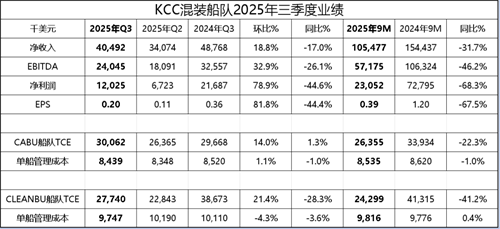 2025年前三季度,KCC混裝船隊實現(xiàn)凈收入1.0億美元,同比減少31.7%;EBITDA達到5717.5萬美元,同比減少46.2%;凈利潤為2305.2萬美元,同比減少68.3%。
