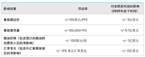 馬士基2025年的財(cái)務(wù)表現(xiàn)受到宏觀經(jīng)濟(jì)、燃油價(jià)格、運(yùn)價(jià)等不確定因素的影響。在其他條件相同的情況下,四個(gè)核心因素對(duì)于利潤(rùn)的影響程度如下: