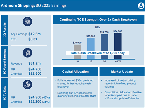 對(duì)于2025年第四季度,Ardmore已經(jīng)以日租金24900美元鎖定了MR油輪約40%的營(yíng)運(yùn)日收入,以日租金22200美元鎖定了化學(xué)品船約35%的營(yíng)運(yùn)日收入。