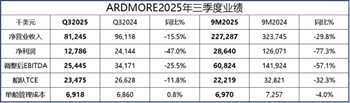 2025年前三季度,Ardmore實(shí)現(xiàn)凈營(yíng)業(yè)收入2.3億美元,同比下降29.8%;調(diào)整后EBITDA為6082.4萬(wàn)美元,同比下降57.1%;凈利潤(rùn)為2864.0萬(wàn)美元,同比下降77.3%。