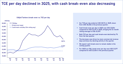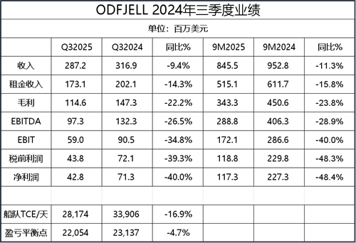 具體而言,2025年三季度,Odfjell實(shí)現(xiàn)總收入2.87億美元,同比下降9.4%;租金收入(TCE)為1.73億美元,同比下降14.3%;毛利1.15億美元,同比下降22.2%;息稅折舊攤銷前利潤(rùn)(EBITDA)為9730萬(wàn)美元,同比下降26.5%;息稅前利潤(rùn)(EBIT)為5900萬(wàn)美元,同比下降34.8%;凈利潤(rùn)為4280萬(wàn)美元,同比下降40.0%。
