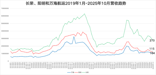 航運(yùn)界網(wǎng)消息,數(shù)據(jù)顯示,長榮海運(yùn)、陽明海運(yùn)和萬海航運(yùn)2025年10月營收都實(shí)現(xiàn)同比和環(huán)比下降。