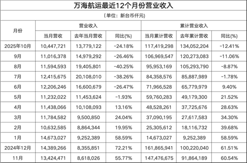 2025年前10個月,萬海航運(yùn)累計實(shí)現(xiàn)營業(yè)收入新臺幣1174.2億元(約37.7億美元),同比下降12.4%。