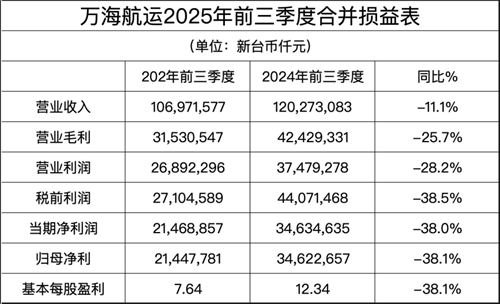 航運(yùn)界網(wǎng)消息,11月11日,萬海航運(yùn)公布2025年前三季度業(yè)績。