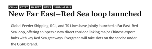 最新消息是,阿聯(lián)酋支線航運(yùn)(GFS)、宏海箱運(yùn)(RCL)和德翔海運(yùn)(RCL),聯(lián)合開(kāi)通了一條中國(guó)-紅海新航線。