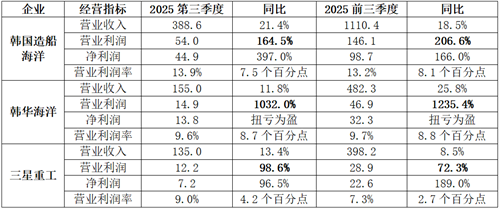 表1 韓國三大船企2025年三季度經(jīng)營業(yè)績(億人民幣)數(shù)據(jù)來源:韓國三大船企企業(yè)財(cái)報(bào),中國船舶集團(tuán)經(jīng)濟(jì)研究中心整理。