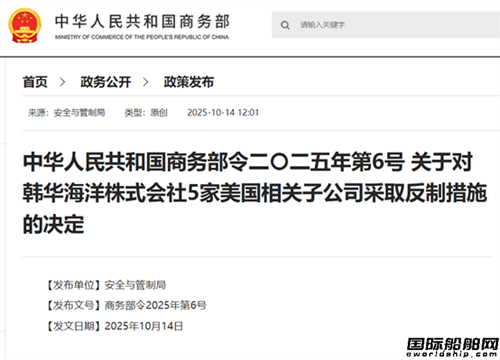 商務(wù)部新聞發(fā)言人指出:“美東時間10月14日,美國開始實施對中國海事、物流和造船領(lǐng)域301調(diào)查的最終措施,嚴(yán)重違反國際法和國際關(guān)系基本準(zhǔn)則,嚴(yán)重?fù)p害中國企業(yè)合法權(quán)益。韓華海洋株式會社在美相關(guān)子公司協(xié)助、支持美國政府對中國海事、物流和造船業(yè)開展301調(diào)查并采取措施。中方對此強烈不滿、堅決反對。為維護自身主權(quán)、安全和發(fā)展利益,根據(jù)《中華人民共和國反外國制裁法》等相關(guān)法律法規(guī),經(jīng)國家反外國制裁工作協(xié)調(diào)機制批準(zhǔn),中方?jīng)Q定將韓華海洋株式會社5家美國相關(guān)子公司列入反制清單,禁止我國境內(nèi)的組織、個人與其進行有關(guān)交易、合作等活動。