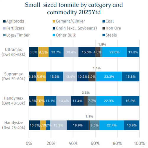 今年前八個(gè)月,從靈便型到極靈便型帶吊散貨船運(yùn)輸噸英里數(shù)據(jù)顯示,糧食(不含大豆)、化肥和鋼材仍是最主要的貨種,占比分別約為10–20%、12–15%和11–14%。
