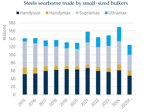 BRS分析師劉青知表示,過(guò)去十年全球海運(yùn)鋼材運(yùn)輸量在2015至2020年間呈溫和下降趨勢(shì),但自2021年以來(lái),這一趨勢(shì)明顯逆轉(zhuǎn),2024年海運(yùn)鋼材量達(dá)到1.7億噸,同比增長(zhǎng)14.2%,帶吊散貨船承擔(dān)了絕大部分運(yùn)輸任務(wù)。2025年前八個(gè)月,這一運(yùn)輸量進(jìn)一步增長(zhǎng)10%,達(dá)到1.2億噸。