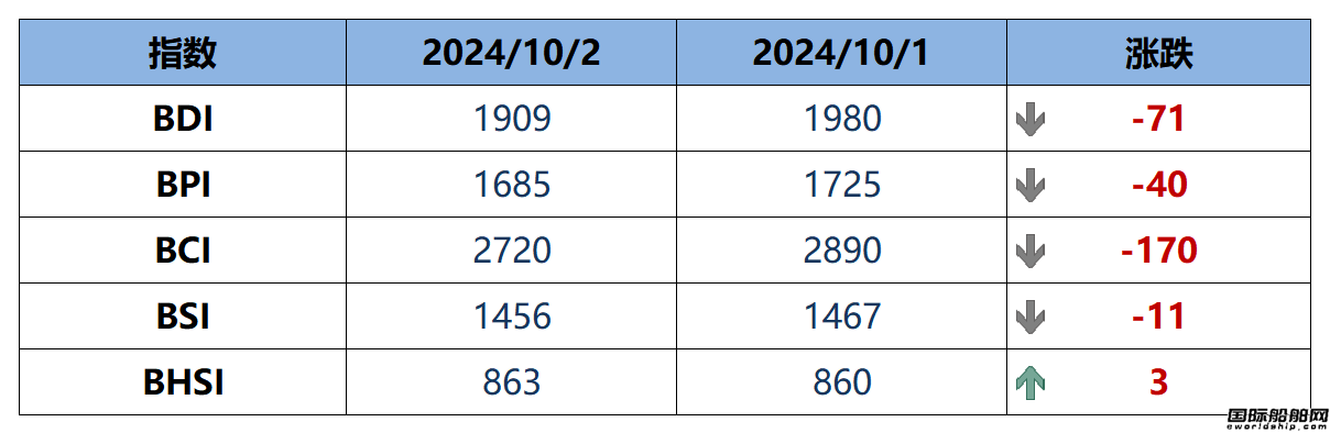 國際船舶網(wǎng)10月2日消息,波羅的海干散貨運(yùn)價(jià)指數(shù)(BDI)周四下跌71點(diǎn),或環(huán)比下降3.59%至1909點(diǎn)。波羅的海好望角型散貨船運(yùn)價(jià)指數(shù)(BCI)下降170點(diǎn),或環(huán)比下降5.88%至2720點(diǎn)。波羅的海巴拿馬型散貨船運(yùn)價(jià)指數(shù)(BPI)下降40點(diǎn),或環(huán)比下降2.32%至1685點(diǎn)。波羅的海超靈便型散貨船運(yùn)價(jià)指數(shù)(BSI)下降11點(diǎn),或環(huán)比下降0.75%至1456點(diǎn)。波羅的海靈便型散貨船運(yùn)價(jià)指數(shù)(BHSI)上升3點(diǎn),或環(huán)比上升0.35%至863點(diǎn)。