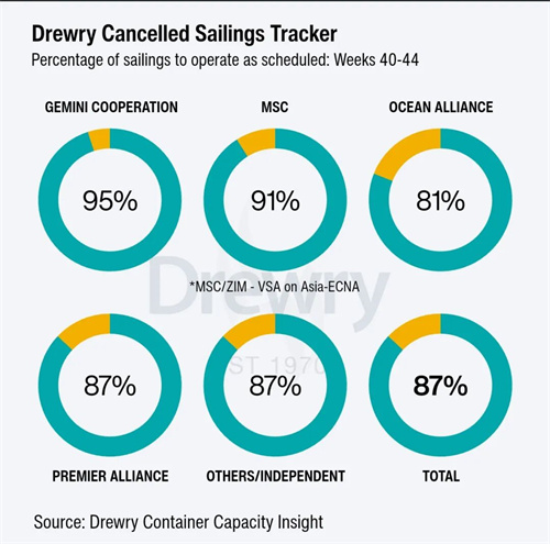在東西向主要貿(mào)易航線上,第37周(9月8-14日)至第41周(10月6-12日)期間,724個(gè)預(yù)定航次中有55個(gè)(占比8%)宣布停航,其中太平洋東向航線占比最高(60%)...