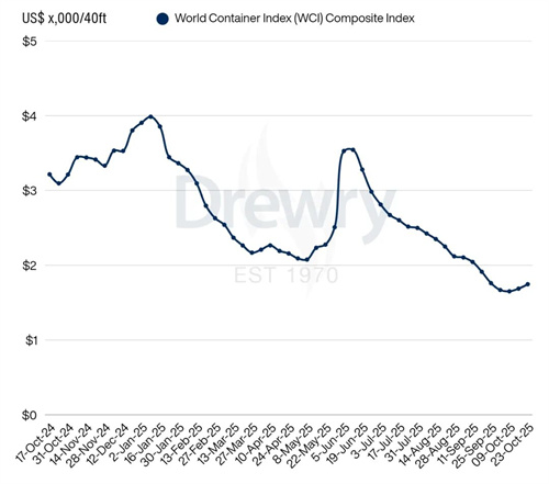Drewry世界集裝箱運價指數(shù)(WCI)本周(截至10月23日)環(huán)比上周上漲3%,約為1,746美元/FEU。