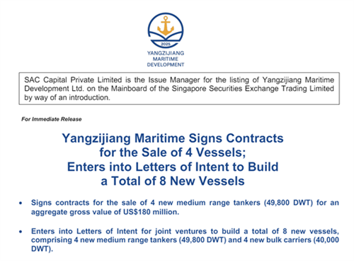 在上市前一天,揚(yáng)子江海事于11月17日宣布三筆交易,將出售4艘新建MR型成品油船,同時(shí)還將建造4艘MR型成品油船和4艘散貨船。