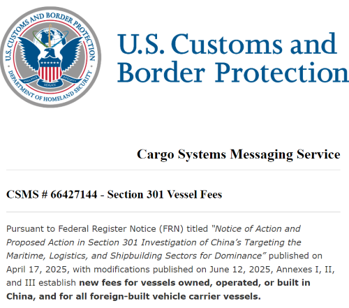 近日,美國海關(guān)與邊境保護(hù)局(CBP)正式發(fā)布了關(guān)于對中國擁有、運營、建造船舶征收港口費用的細(xì)則。根據(jù)美國《聯(lián)邦公報》于2025年4月17日發(fā)布的《關(guān)于中國在海事、物流和造船領(lǐng)域主導(dǎo)地位的301條款調(diào)查行動與擬議行動通知》,并結(jié)合6月12日公布的修改內(nèi)容,規(guī)定了針對中國擁有、運營或建造的船舶,以及所有外國建造的汽車運輸船的新費用。