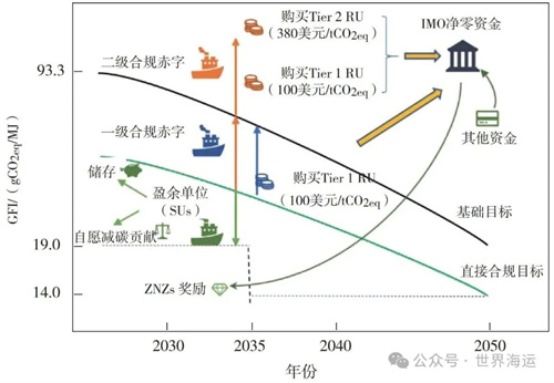 IMO將設(shè)立凈零基金 ( IMO Net-Zero Fund ),旨在通過(guò)碳定價(jià)機(jī)制籌集資金,推動(dòng)航運(yùn)業(yè)的溫室氣體減排。資金主要來(lái)源于船舶購(gòu)買Tier 1 RU和Tier 2 RU的收益。凈零基金主要用于獎(jiǎng)勵(lì)低于ZNZs閾值的船舶,支持研發(fā)與基建,資助發(fā)展中國(guó)家進(jìn)行海事人員培訓(xùn),補(bǔ)償因航運(yùn)減排措施引起的運(yùn)費(fèi)上漲對(duì)最脆弱國(guó)家的糧食、能源等進(jìn)口成本上升造成的負(fù)面經(jīng)濟(jì)影響等。