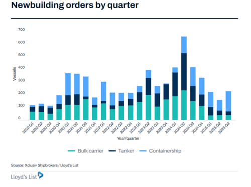 勞氏日?qǐng)?bào)追蹤的數(shù)據(jù)顯示,2025年第三季度,全球范圍內(nèi)共訂購了277艘載重噸位在5000DWT以上的商船。