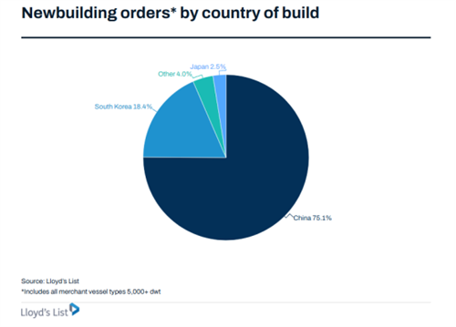 勞氏日?qǐng)?bào)追蹤的新造船訂單活動(dòng)顯示,2025年第三季度,按船舶數(shù)量計(jì)算,75%的訂單由中國船廠獲得。