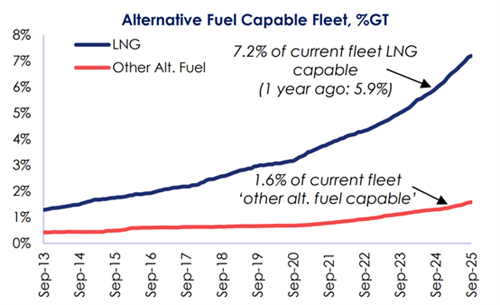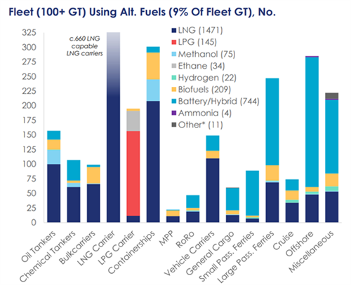 根據(jù)克拉克森的數(shù)據(jù),整體而言按噸位計(jì)算,截至目前在運(yùn)營船隊(duì)中能夠使用替代燃料或推進(jìn)裝置船舶的比例已經(jīng)提高到了8.8%,高于2017年的2.6%和2024年年初的6.5%。在現(xiàn)有總計(jì)2557艘替代燃料船舶中,包括1471艘LNG動(dòng)力船、75艘甲醇動(dòng)力船、145艘LPG動(dòng)力船、744艘電池/混合動(dòng)力推進(jìn)船,此外還有279艘采用其他燃料。