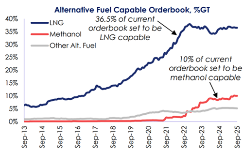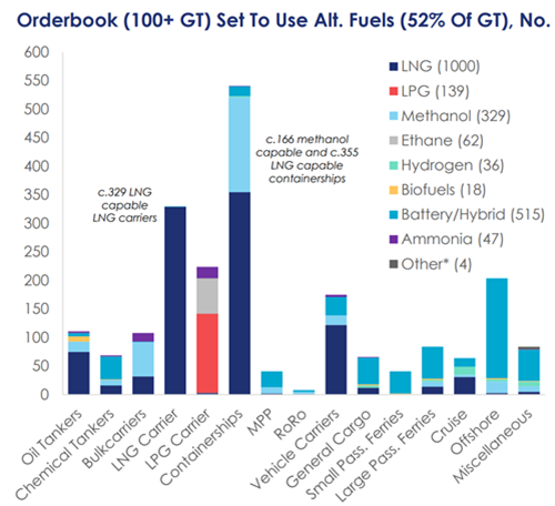 今年的替代燃料船舶訂單包括LNG動(dòng)力船141艘1920萬總噸,甲醇動(dòng)力船53艘610萬總噸,LPG動(dòng)力船14艘60萬總噸,乙烷動(dòng)力船4艘10萬總噸,以及電池/混合動(dòng)力推進(jìn)船舶93艘130萬總噸。