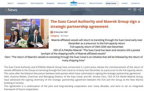 11月25日,蘇伊士運河管理局(SCA)與全球航運巨頭馬士基集團(Maersk)在伊斯梅利亞簽署了一份具有里程碑意義的戰(zhàn)略合作伙伴協(xié)議。然而,這場旨在展示合作的高層會晤,卻因一份聲明引發(fā)了市場的劇烈震動。