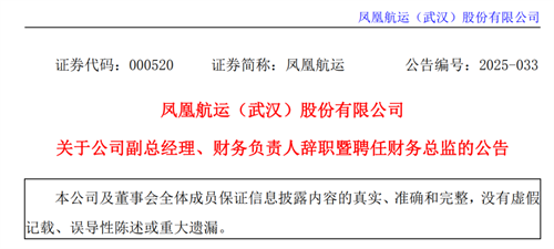同時,鳳凰航運稱,經(jīng)公司總經(jīng)理提名,董事會提名委員會資格審查以及獨立董事、董事會審計委員會審議通過,公司于 2025 年 9 月 5 日召開第九屆董事會第二十一次會議,審議通過了《關(guān)于聘任財務(wù)總監(jiān)的議案》,同意聘任汪國政先生為公司財務(wù)總監(jiān),任期自本次董事會審議通過之日起至第九屆董事會任期屆滿之日止。
