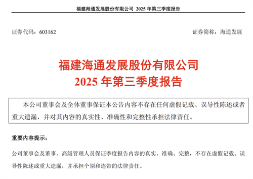 10月17日,福建海通發(fā)展股份有限公司(證券代碼:603162 ,以下簡稱“海通發(fā)展”)發(fā)布《2025 年第三季度報(bào)告》。